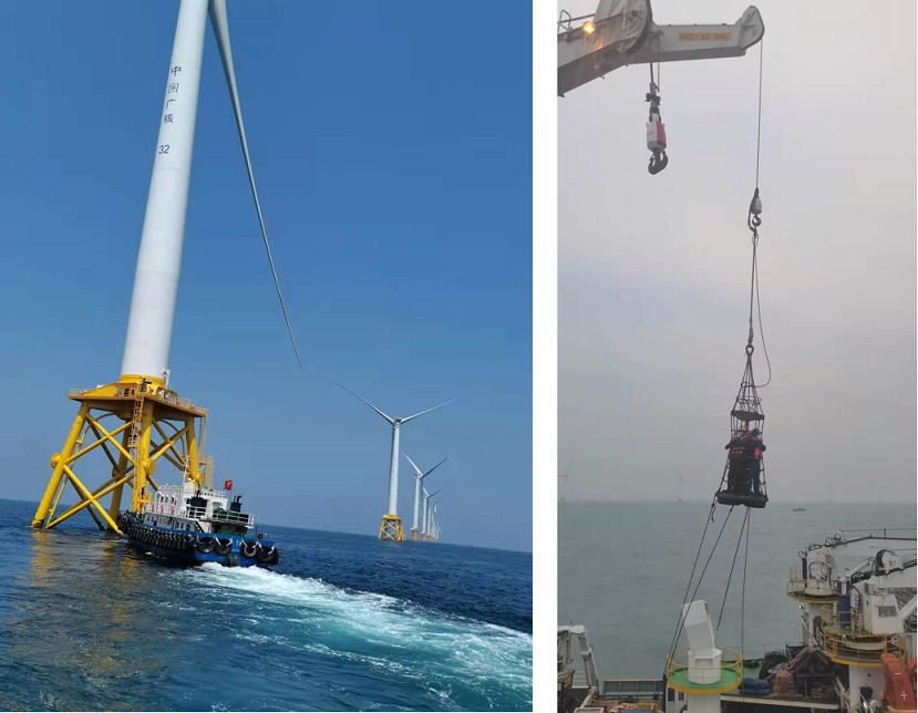 試驗(yàn)過程中,因海浪大的原因無法人工攀爬上風(fēng)機(jī)塔筒,在中廣核安排下通過吊運(yùn)安全抵達(dá)塔筒進(jìn)行檢測(cè)工作;抵達(dá)塔筒后技術(shù)人員們迅速進(jìn)入技術(shù)檢測(cè)工作,搶抓施工窗口期,在其高效協(xié)作下于2020年12月14日珠高檢測(cè)圓滿完成35kV海底電纜試驗(yàn)。