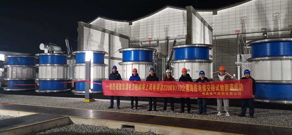 2020年11月20日珠高電氣檢測有限公司(以下簡稱:珠高檢測)在射陽海上南區(qū)H2#30萬千瓦風(fēng)電項目海底電纜交接試驗圓滿完成。本次海纜系統(tǒng):由127/220kV 3×500mm2海底光電復(fù)合纜三芯交聯(lián)聚乙烯絕緣電力電纜和2套GIS終端及2套中間接頭組成,全長70公里,是目前國內(nèi)最長的220kV海纜系統(tǒng),試驗內(nèi)容包括:核相檢查,絕緣電阻測量,交流耐壓試驗,線路工頻參數(shù)測量;由于線路長容量大,本次交流耐壓試驗對設(shè)備的長期運(yùn)行和熱穩(wěn)定性是極大的考驗,此次設(shè)備是珠高檢測自有設(shè)備:XZF-520kV/78000kVA變頻串聯(lián)諧振試驗系統(tǒng),由2臺400kW變頻電源柜、2臺400kVA勵磁變壓器和6臺260kV/50A電抗器以及采集和控制系統(tǒng)組成。